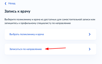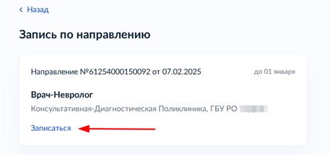 После нажатия «Записаться» выйдет списков врачей по профилю указанному в электронном направлении и возможностью записаться на прием на конкретную дату и время в организации в которую выдано направление.